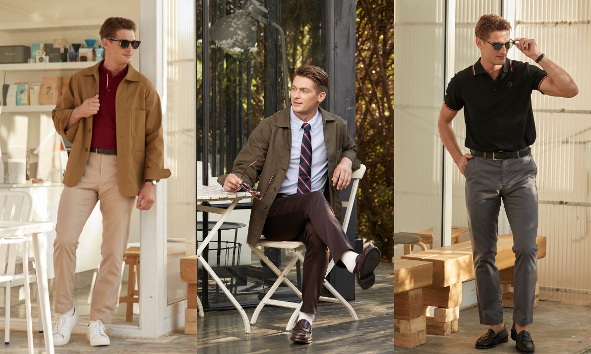 ลุคแคชชวลในวันพิเศษที่สามารถเลือกมิกซ์แอนด์แมตช์กับเสื้อยืดโปโลคอปกสีแดงกับกางเกงสีอ่อน จาก ELLE Homme คอมพลีตลุคด้วยเสื้อแจ็กเก็ตเพิ่มความเท่ตามแบบหนุ่มปารีเซียง