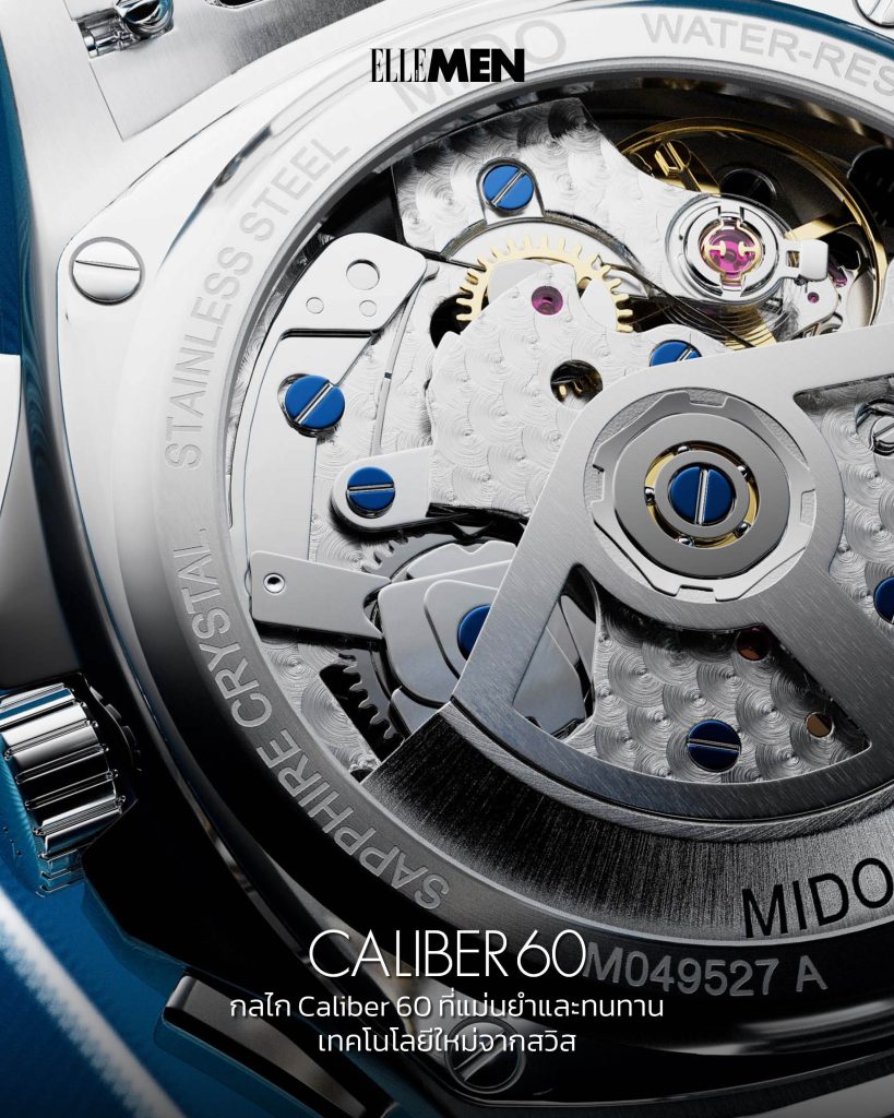 หัวใจของ Multifort TV Chronograph คือ MIDO Caliber 60 กลไกอัตโนมัติที่พัฒนาบนพื้นฐาน ETA A05.231 ให้กำลังลานสำรองถึง 60 ชั่วโมง พร้อมเทคโนโลยี Nivachron™ balance spring ซึ่งทนต่อแรงแม่เหล็ก การกระแทก และการเปลี่ยนแปลงของอุณหภูมิ งานขัดแต่งก็โดดเด่นไม่แพ้กัน จากฝาหลังใสสามารถมองเห็น rotor แบบ skeleton, สกรูสีน้ำเงิน และสะพานจักรขัดลายวงกลม ซึ่งสะท้อนถึงมาตรฐานการผลิตระดับสูงของนาฬิกาสวิส