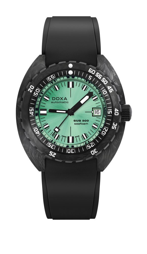 ส่งท้ายด้วยลุคโฉบเฉี่ยวของนาฬิกาดำน้ำ Doxa รุ่น SUB 300 Carbon Seafoam มาในตัวเรือนฟอร์กคาร์บอนและไทเทเนียมด้านใน ช่วยเสริมความแข็งแกร่งและทนทานต่อการดำน้ำได้ลึกถึง 300 เมตร ปกป้องด้วยกระจกแซปไฟร์โค้งแบบโดมที่ถอดต้นแบบมาจากกระจกเพล็กซิกลาสโค้งของรุ่นดั้งเดิมในปี 1967 ความเด่นที่สุดต้องยกให้กับหน้าปัดสีเขียวพาสเทลตกแต่งแบบซันเรย์ ที่ช่วยในการอ่านค่าได้อย่างชัดเจนแม้ในที่มืดหรือใต้น้ำลึก ตอบสนองทั้งการใช้งานในชีวิตประจำวันและความสมบุกสมบันในทุกๆ การผจญภัยอันท้าทายของหนุ่มๆ