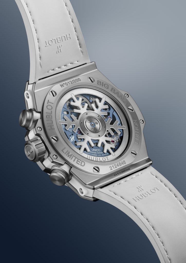 การผสมผสานนวัตกรรมวัสดุล้ำสมัยของ Hublot รุ่น Big Bang Unico Winter Titanium Ceramic ที่รวบรวมความมีน้ำหนักเบาและทนทานของตัวเรือนไทเทเนียม เข้ากับความสวยเด่นของขอบตัวเรือนเซรามิกสีขาวไร้รอยขีดข่วน พร้อมด้วยหน้าปัดแบบสเกเลตันตกแต่งด้วยโทนสีฟ้าและขาว รับไปกับสายยางและหนังสีขาวและฟ้าเช่นกัน ฝาหลังยังเป็นกระจกแซปไฟร์ใสโชว์โรเตอร์ตกแต่งด้วยรูปเกล็ดหิมะ