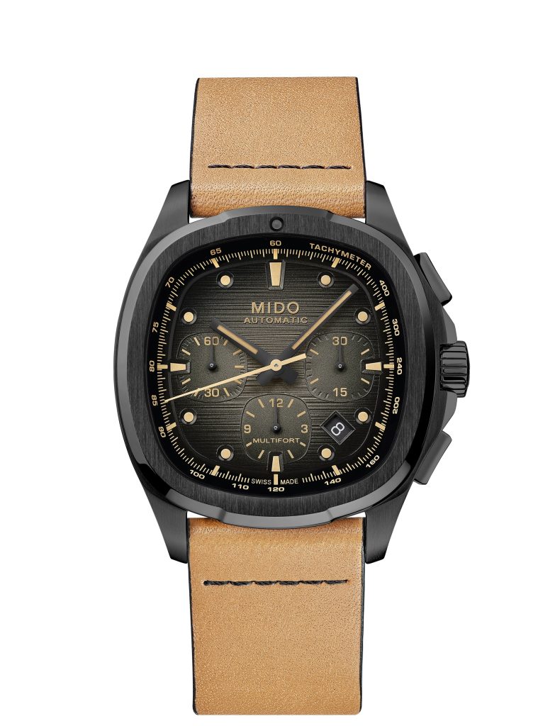 นาฬิกาโครโนกราฟแบบวินเทจร่วมสมัยของ Mido รุ่น Multifort TV Chronograph ใหม่ในตัวเรือนทรง TV แบบเหลี่ยมมนและเคลือบ PVD ไล่เฉดสีเทาสู่สีดำ ทั้งยังผ่านการตกแต่งแบบขัดซาตินสลับขัดเงา ลงตัวเข้ากับหน้าปัดสีดำ บรรจุเข็มชี้ชั่วโมงและนาที และเข็มบนหน้าปัดย่อยจับเวลาเคลือบแล็กเกอร์สีเบจ เปลี่ยนสายได้ระหว่างสายหนังหรือสายเคลือบสีดำ เสริมความคลาสสิกและโก้หรูแบบครบจบในเรือนเดียว