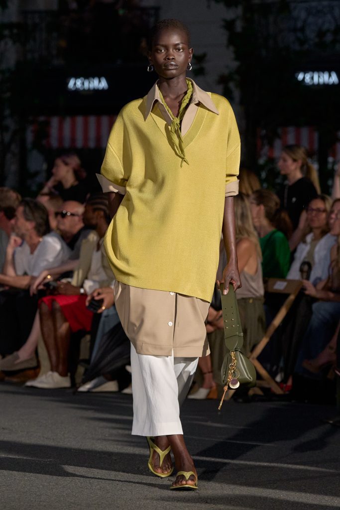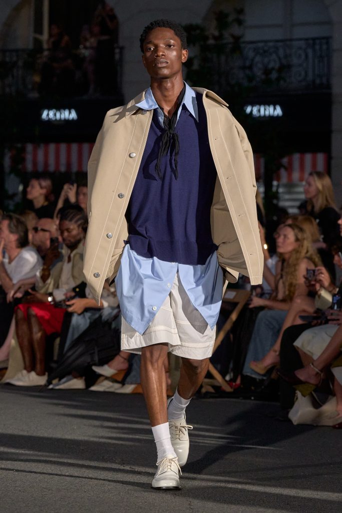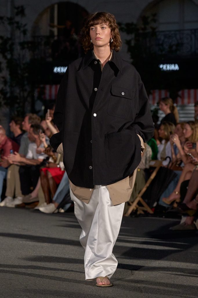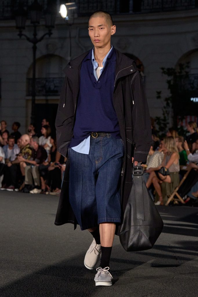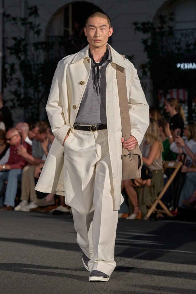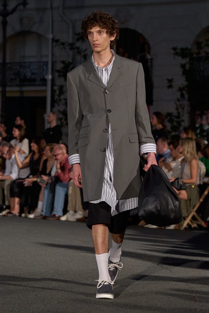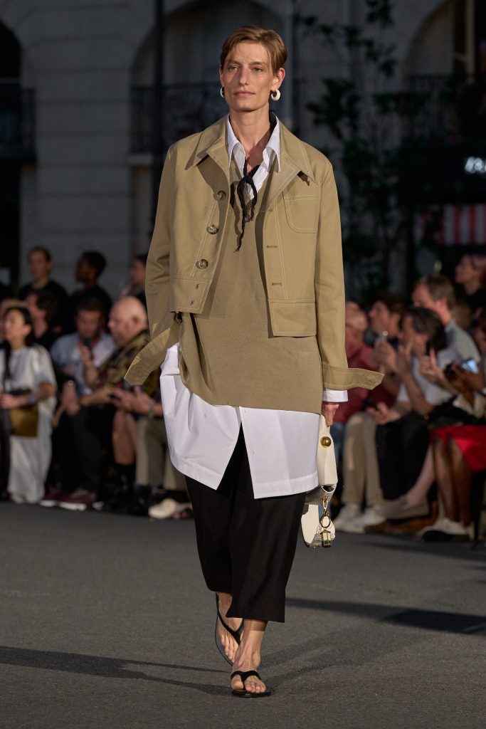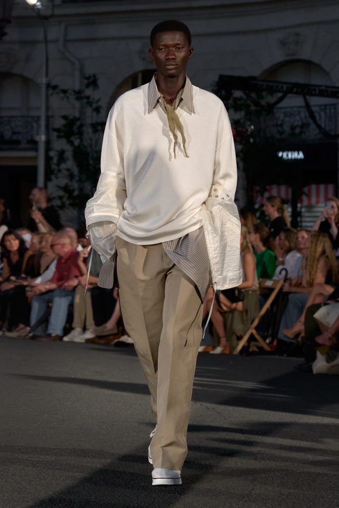 ลุคไฮไลต์ของโชว์เห็นได้ชัดจากการมิกซ์ชุดสูทหลวมเล็กน้อยกับเสื้อเชิ้ตปลดกระดุม หรือเสื้อถักลายทางสวมกับกางเกงขาบานที่ขยับตัวได้อย่างอิสระ คลุมทับด้วยเบลเซอร์บางเบาในสีลูกกวาด ทั้งหมดสื่อถึงความเป็นชายและหญิงในแบบที่ไม่ต้องเลือกข้าง และสะท้อนความร่วมสมัยแบบไร้พรมแดนทางเพศ
