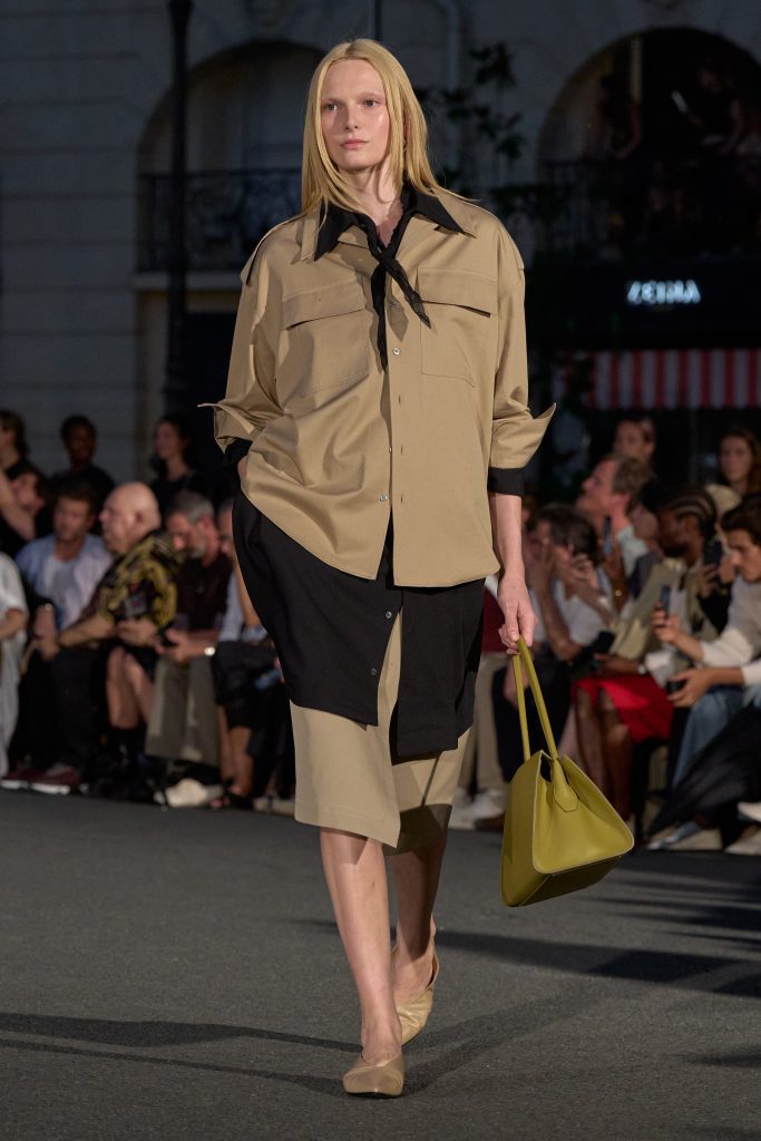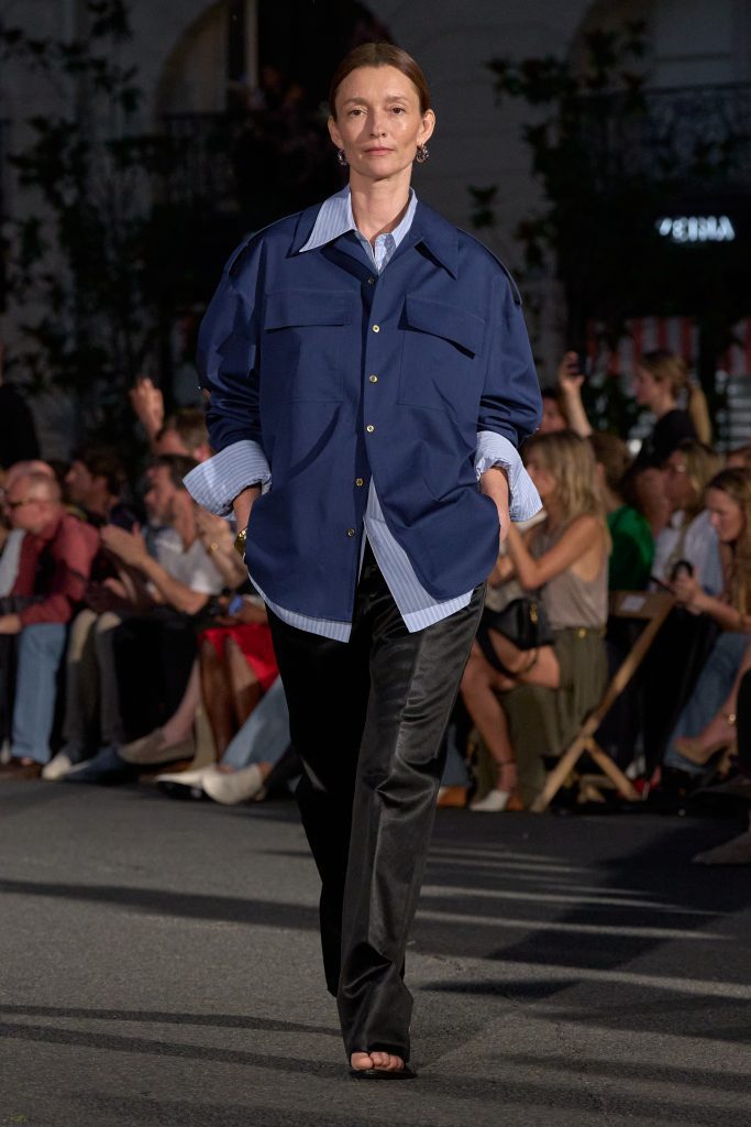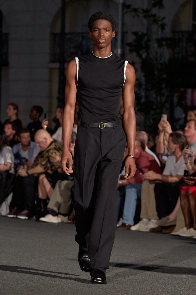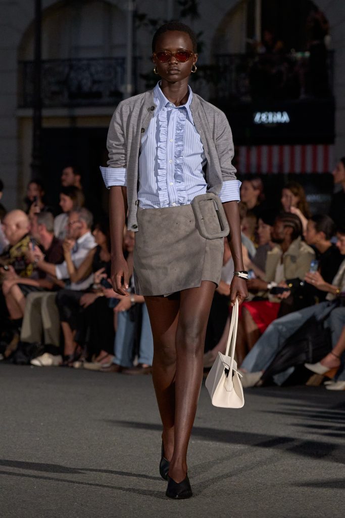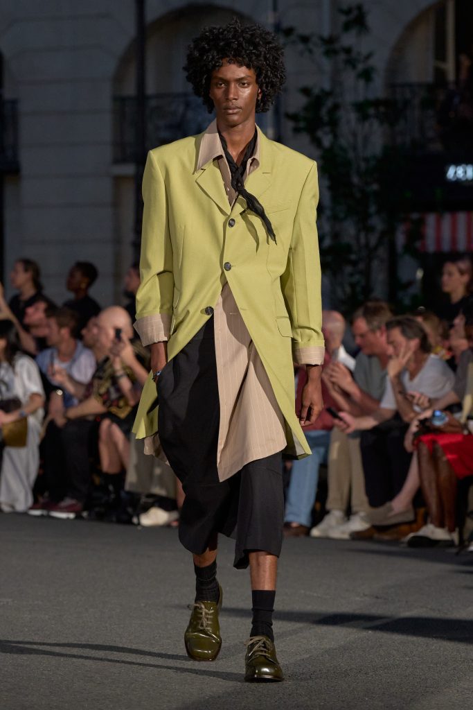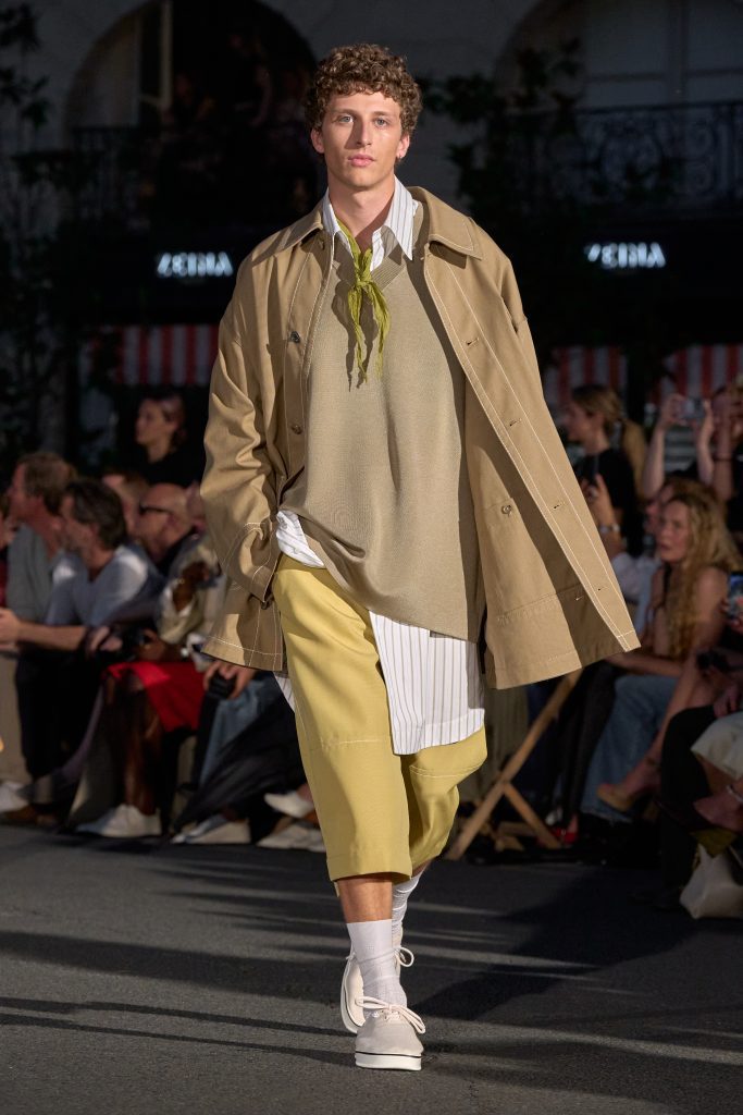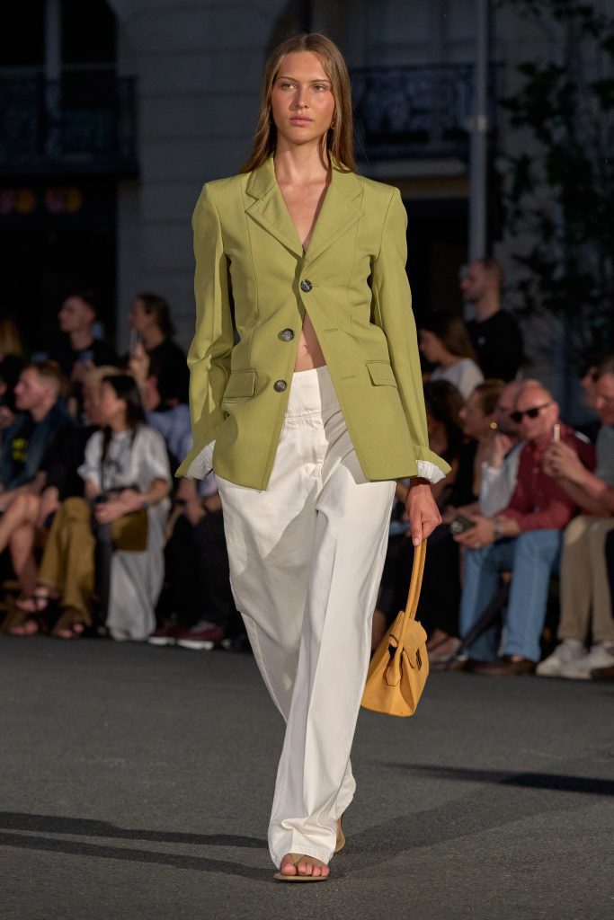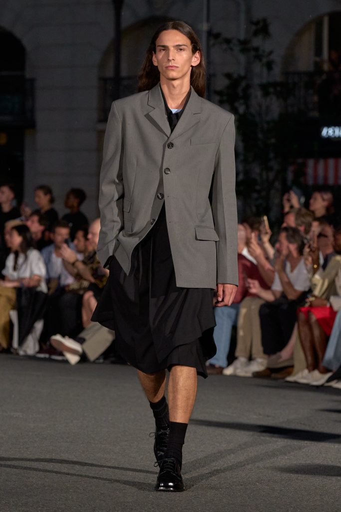 ลุคไฮไลต์ของโชว์เห็นได้ชัดจากการมิกซ์ชุดสูทหลวมเล็กน้อยกับเสื้อเชิ้ตปลดกระดุม หรือเสื้อถักลายทางสวมกับกางเกงขาบานที่ขยับตัวได้อย่างอิสระ คลุมทับด้วยเบลเซอร์บางเบาในสีลูกกวาด ทั้งหมดสื่อถึงความเป็นชายและหญิงในแบบที่ไม่ต้องเลือกข้าง และสะท้อนความร่วมสมัยแบบไร้พรมแดนทางเพศ