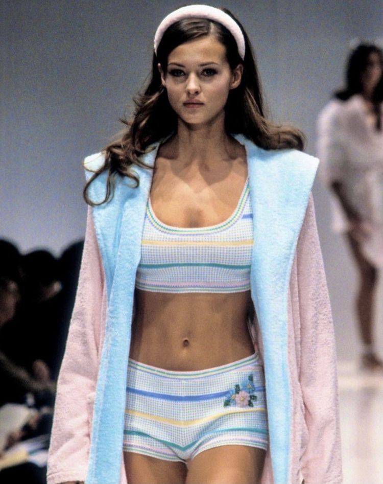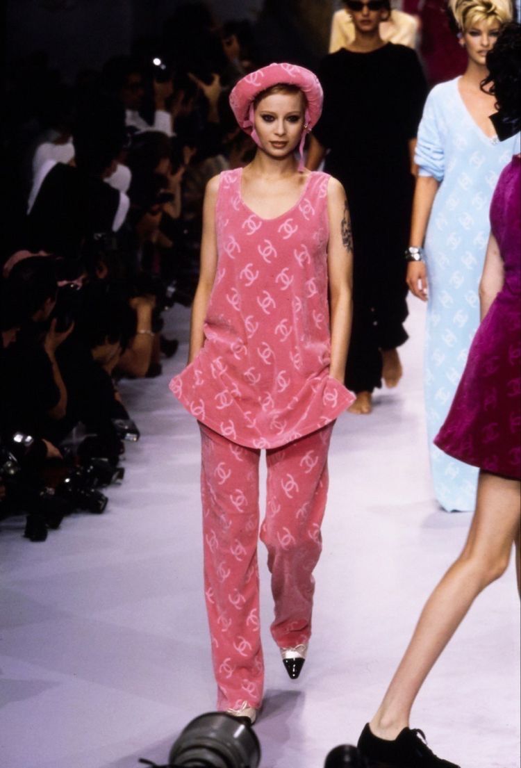 แต่ถ้าถามว่า ‘ผ้าเทอร์รี่’ หรือ ‘ผ้าขนหนู’ นั้นเดบิวต์บนรันเวย์ไฮแฟชั่นอย่างจริงจังครั้งแรกก็คงต้องเป็นในช่วงยุค ’90s ที่เราจะเห็นผ้าชนิดนี่วิ่งเล่นเต็มที่บนแคตวอล์คไฮแบรนด์ต่างๆ ตั้งแต่ Chanel คอลเล็กชั่น Ready-to-Wear Spring/Summer 1996 ที่ Karl Lagerfeld (คาร์ล ลาเกอร์เฟล) ดีไซเนอร์ในตำนานได้นำผ้าเทอร์รี่มาครีเอตเป็นชุดว่ายน้ำและมินิเดรสประดับโลโก้ซีไขว้ จนกลายเป็นฮอตไอเทมที่เป็นที่ต้องการของคอแฟชั่นทั่วโลกมาจนถึงปัจจุบัน