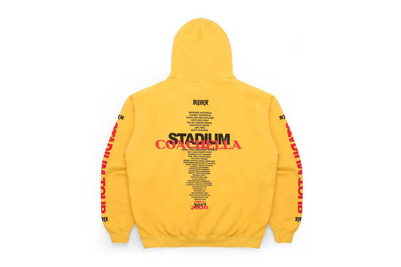 นอกจากลุคเด่นบนเวที Bieber ยังปล่อยเมอร์ชคอลเล็กชั่นใหม่สำหรับ Weekend 2 ที่หยิบแรงบันดาลใจจาก Purpose Tour มาตีความอีกครั้ง ราวกับพาผู้ชมย้อนกลับไปสู่ช่วงปี 2016–2017 ที่กราฟิกทัวร์และสตรีทแวร์กำลังอยู่ในจุดพีค ดีไซน์ยังคงยึดโครงสร้างดั้งเดิม ฟอนต์โกธิก ลายพิมพ์ด้านหลังขนาดใหญ่ และสัดส่วนโอเวอร์ไซส์แบบเสื้อทัวร์วินเทจ ก่อนเติมเลเยอร์ใหม่ผ่านไลน์ “SWAG” ที่ตั้งใจเล่นกับอารมณ์อินเทอร์เน็ตยุคเก่าอย่างมีลูกเล่น