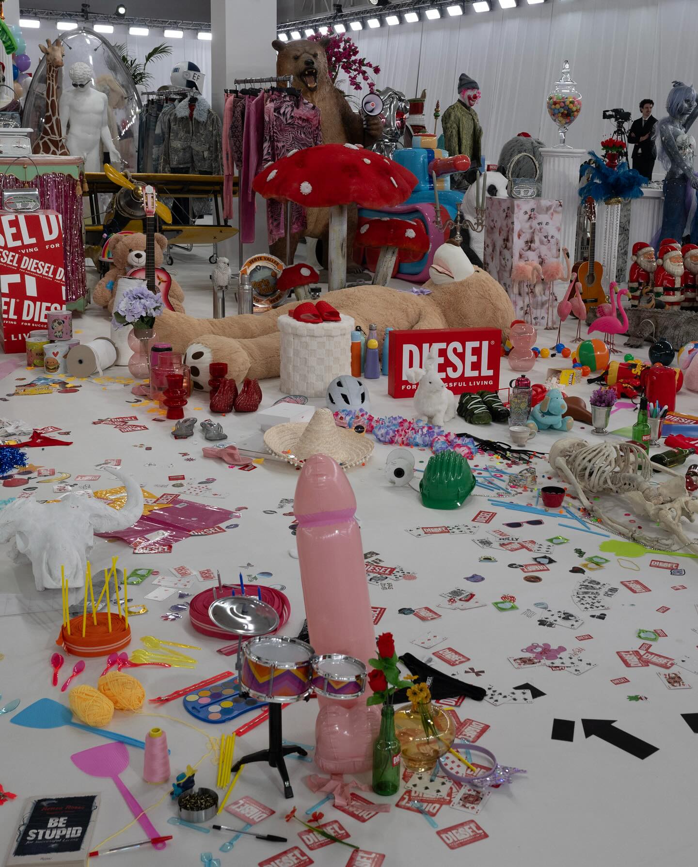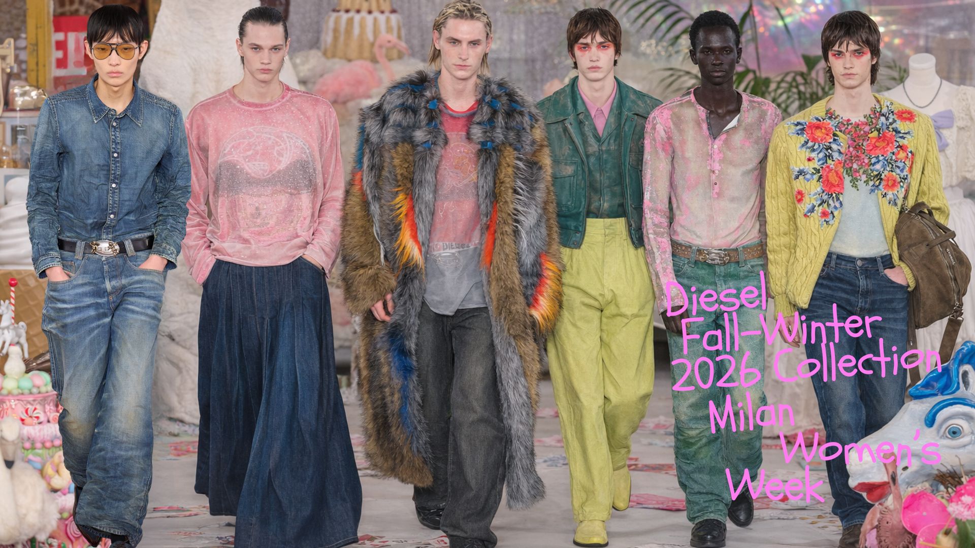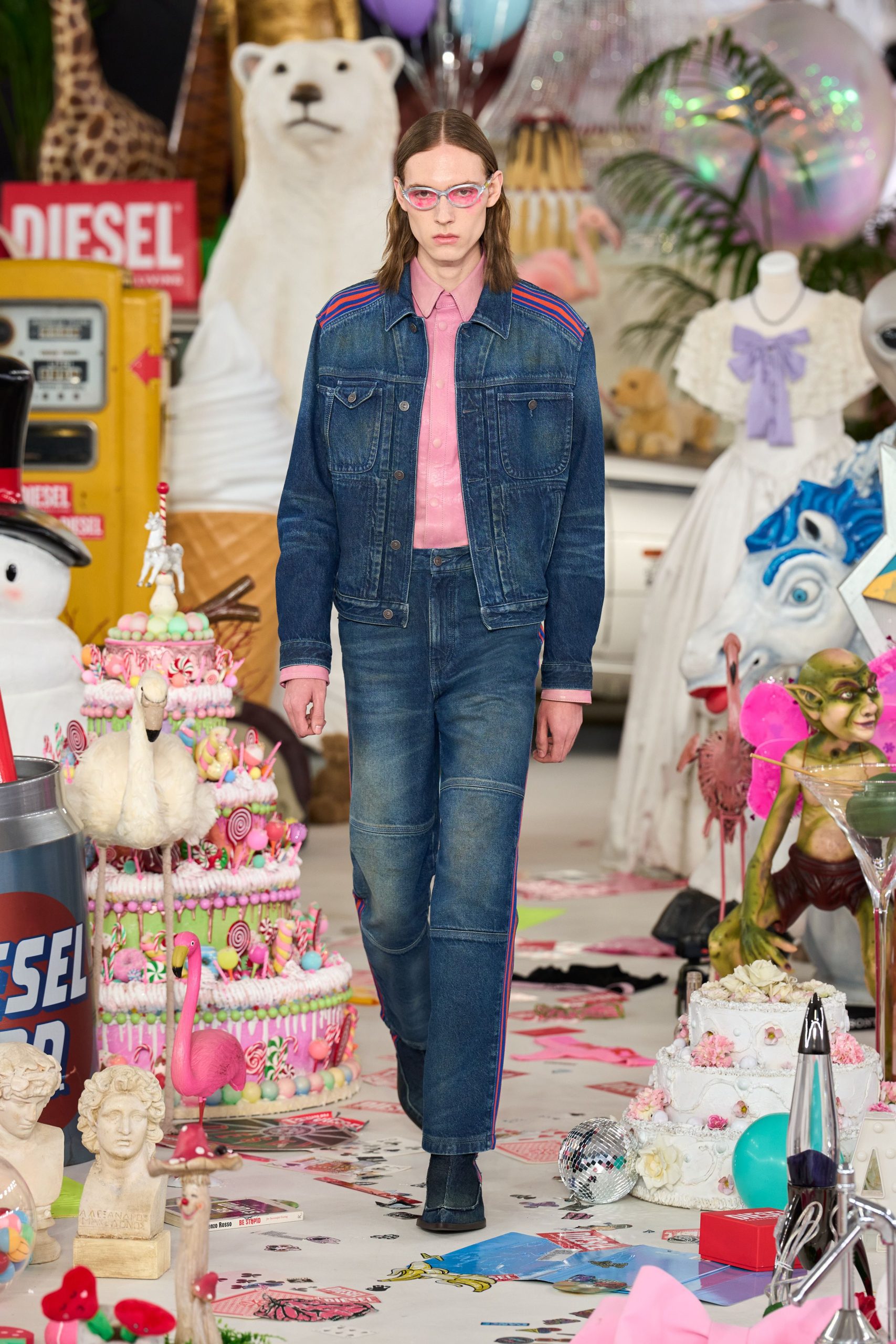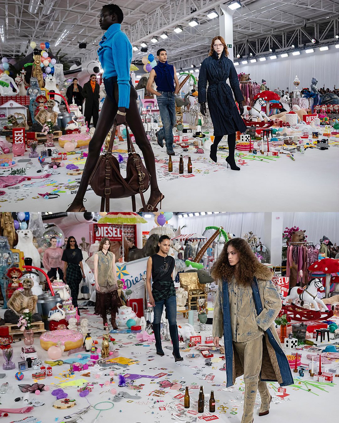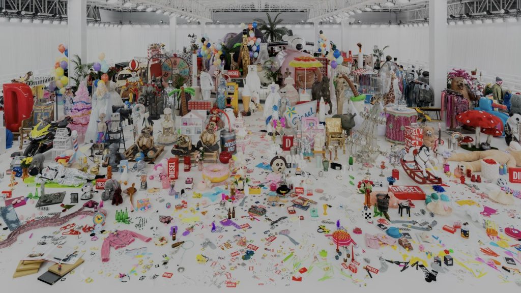 บนรันเวย์ที่มิลาน Glenn Martens พาแขกผู้ชมดำดิ่งสู่จักรวาลของ Diesel ด้วยการจัดแสดงคอลเล็กชั่น Fall-Winter 2026 ท่ามกลางพร็อพและวัตถุกว่า 50,000 ชิ้น เนรมิตพื้นที่ให้กลายเป็น “สวน” แห่งความเหนือจริงที่ชวนให้นึกถึงภาพวาดระดับมาสเตอร์พีซอย่าง The Garden of Earthly Delights ในเวอร์ชั่นโพสต์โมเดิร์นที่เต็มไปด้วยพลังป๊อปอาร์ต ความเฮโดนิสต์ และแม็กซิมัลลิสม์อันจัดจ้าน