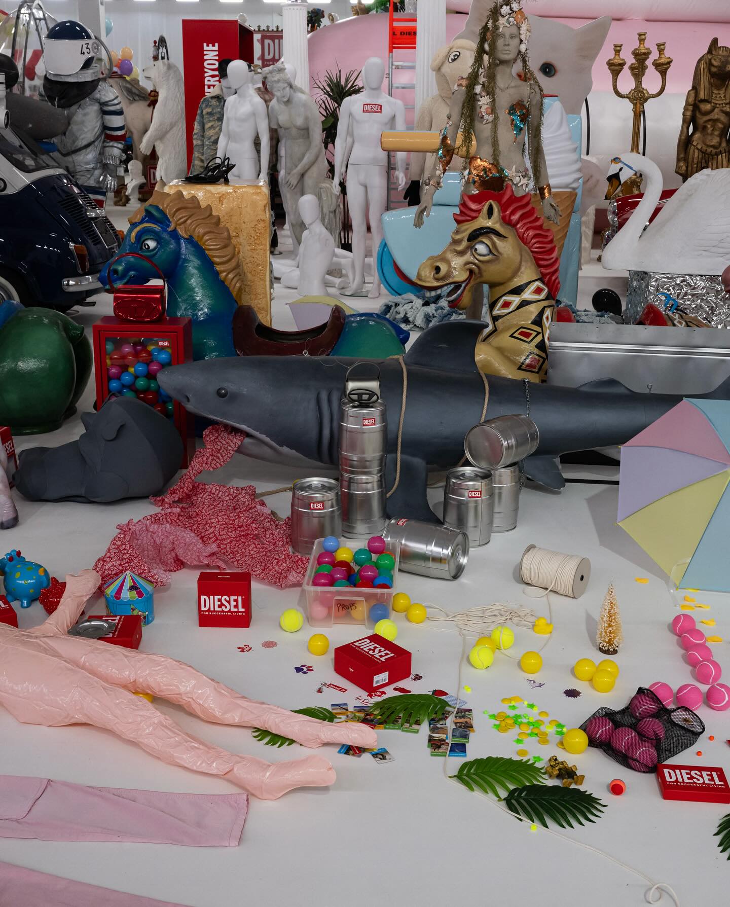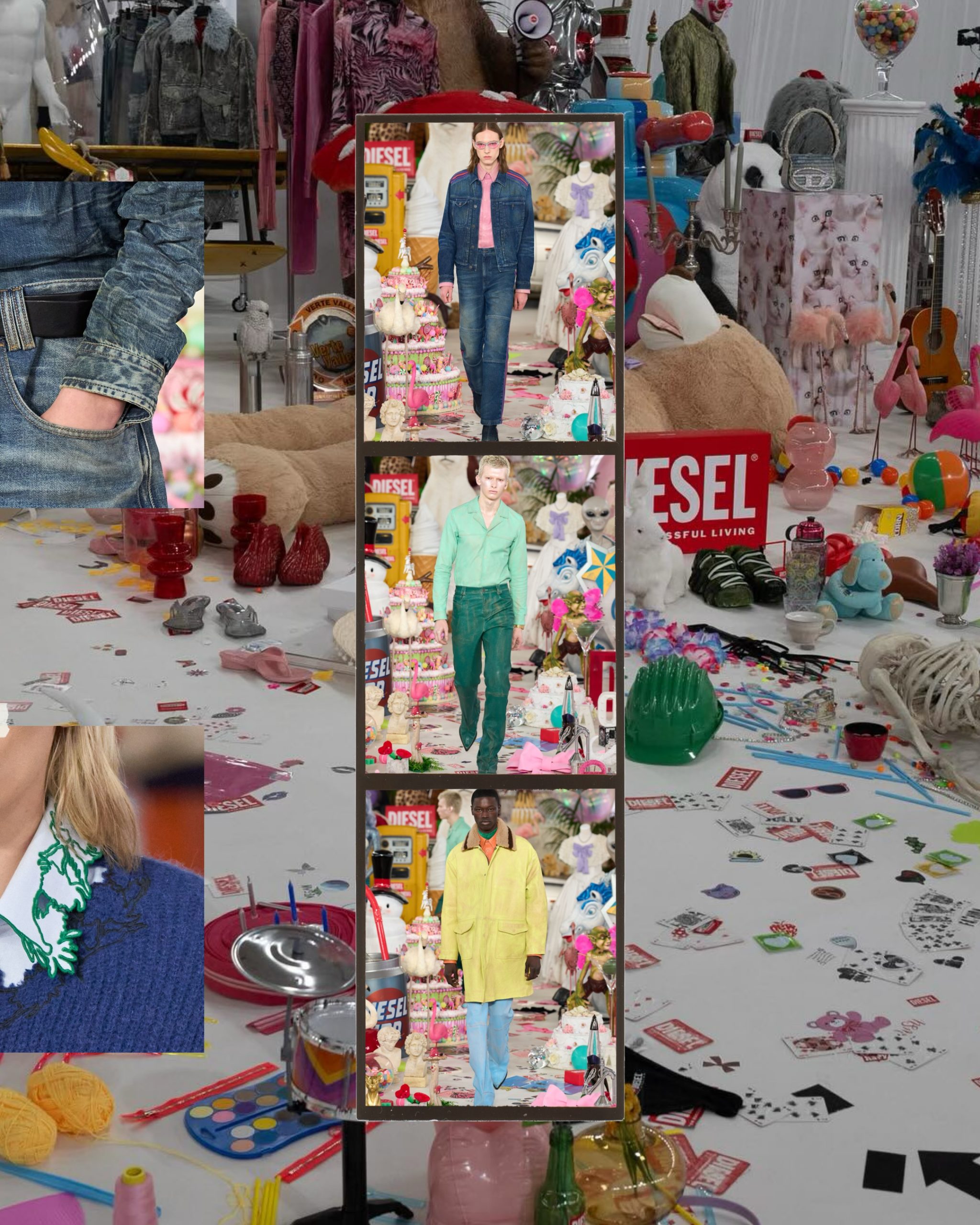 เหล่านางแบบและนายแบบก้าวผ่านภูมิทัศน์เหนือจริงที่รายล้อมด้วยฟิกเกอร์ขนาดเท่าของจริง ตั้งแต่หมีขั้วโลก เอเลี่ยน ไปจนถึงซานตาคลอส เคียงข้างอินฟเลเทเบิลขนาดยักษ์ พืชพรรณ และแม้แต่รถยนต์ที่ถูกจัดวางปะปนกับเสื้อผ้าและจิวเวลรี่ ราวกับโลกแฟนตาซีที่ถูกบีบอัดไว้ในพื้นที่เดียว