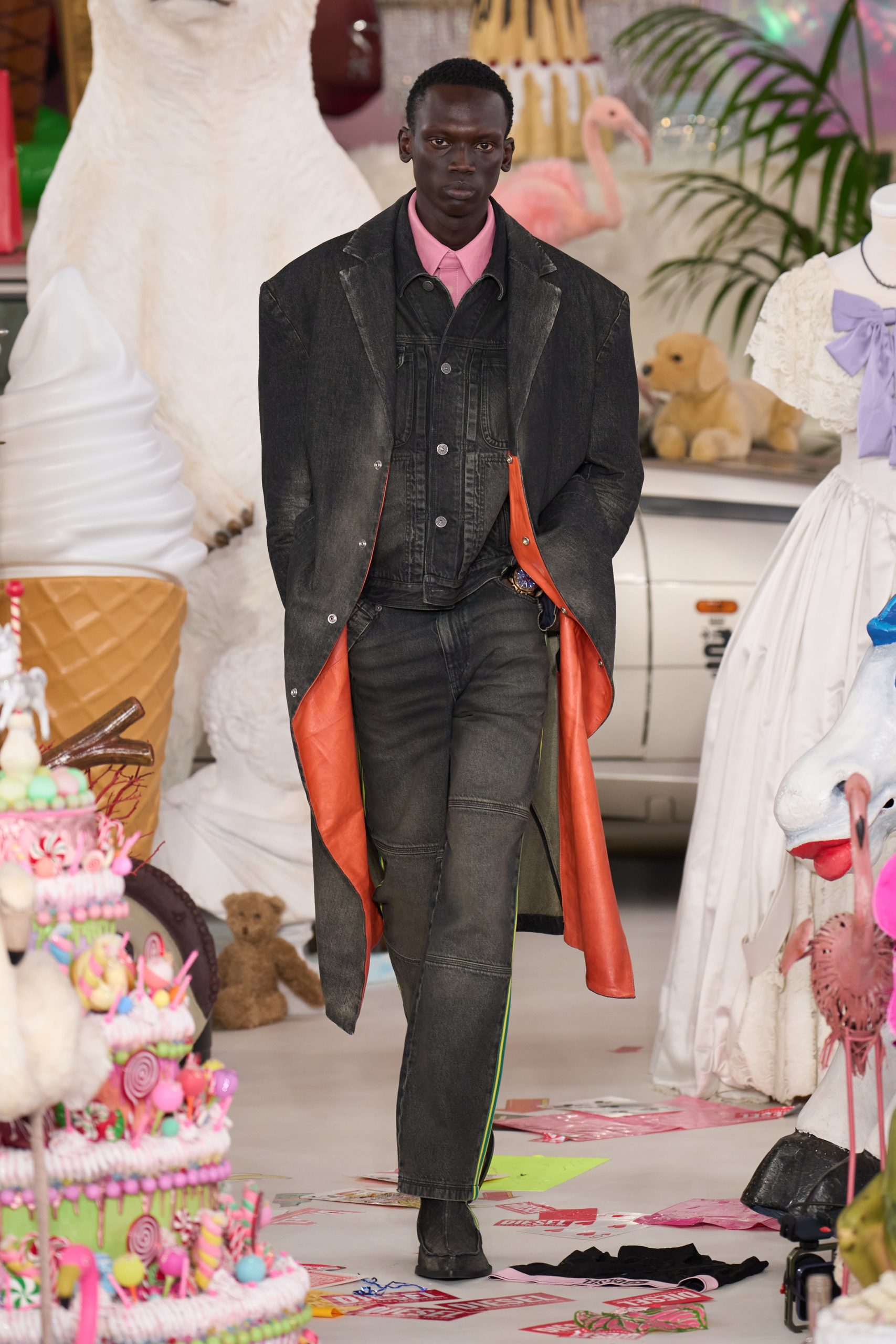 โชว์เปิดด้วยลุคที่โฟกัสเดนิมและนิตแวร์ กางเกงยีนส์คลาสสิกของ Diesel ถูกฟอกและสร้างรอยยับอย่างจงใจ ขณะที่เสื้อเจอร์ซีย์และสเวตเตอร์ถักถูกบิดและขยำจนเกิดรูปทรงไร้โครงสร้าง คล้ายประติมากรรมสวมใส่ได้ ผ้า felt รีไซเคิลที่มีผิวสัมผัสคล้ายฉนวนกันความร้อนถูกเทเลอร์เป็นโอเวอร์โค้ตและสูทสองชิ้น สะท้อนแนวคิดการยกระดับวัสดุธรรมดาสู่ซิลูเอตเชิงสถาปัตยกรรม