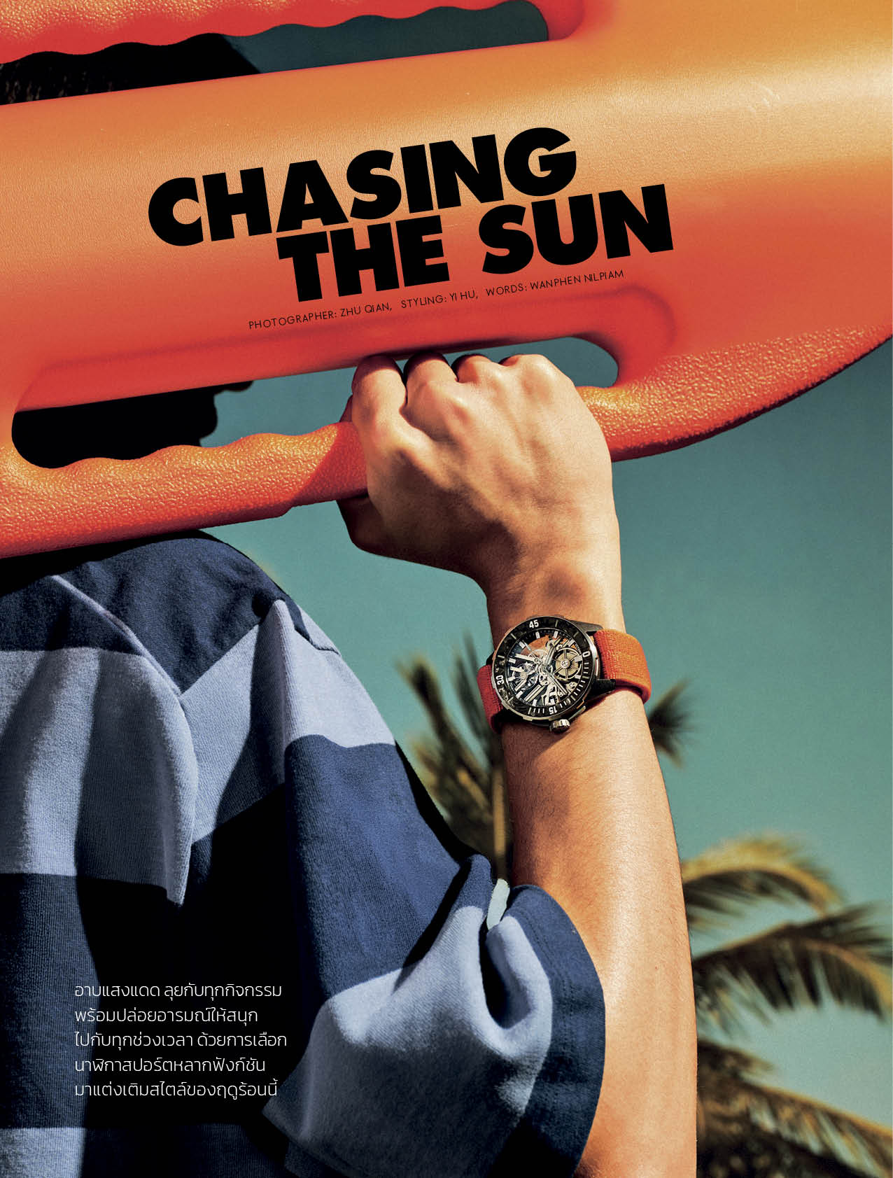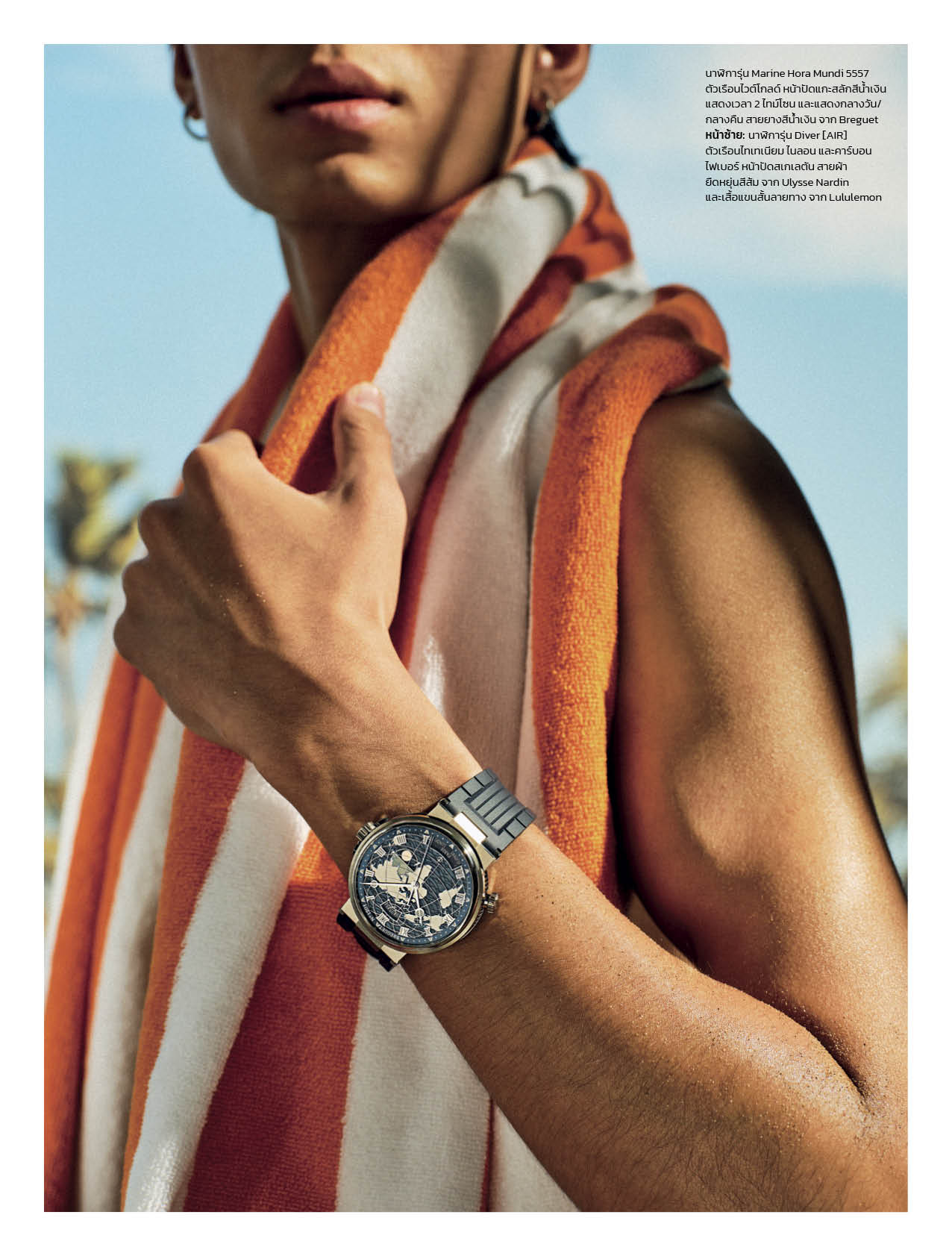 Poolside Precision และ Chasing the Sun คือสองอารมณ์ของฤดูร้อนที่ถูกถ่ายทอดผ่านเรือนเวลาอย่างมีสไตล์ จากโมงยามริมสระที่เปี่ยมด้วยสีสัน ไปจนถึงกิจกรรมกลางแดดที่ต้องการทั้งฟังก์ชันและพลังของดีไซน์ ไม่ว่าจะเป็น Omega Seamaster Planet Ocean 600M ที่โดดเด่นด้วยหน้าปัดเซรามิกสีขาวและขอบสีส้มสด ไปจนถึง Ulysse Nardin Diver [AIR] ที่ผสานวัสดุไฮเทคเข้ากับหน้าปัดสเกเลตันในลุคสปอร์ตจัดจ้าน ขณะที่ Breguet Marine Hora Mundi 5557 เติมมิติด้วยฟังก์ชันสองไทม์โซนบนหน้าปัดแกะสลักสีน้ำเงิน เช่นเดียวกับ Chopard Alpine Eagle XL Chrono ที่ถ่ายทอดแรงบันดาลใจจากม่านตานกอินทรีอย่างสง่างาม ด้าน Hublot Big Bang Unico Yellow Sapphire คือการประกาศตัวตนผ่านแซปไฟร์สีเหลืองโปร่งใส ขณะที่ TAG Heuer Aquaracer Professional 300 และ Zenith DEFY Extreme Diver ก็สะท้อนจิตวิญญาณนักผจญภัยผ่านดีไซน์ที่พร้อมลุยทุกสภาพแวดล้อม ทั้งหมดนี้ถูกคอมพลีตด้วยไอเท็มจาก Lululemon, Fendi และ Lanvin ที่ร่วมกันนิยามฤดูร้อนให้เต็มไปด้วยพลังและความเฉียบคมในทุกมิติของสไตล์