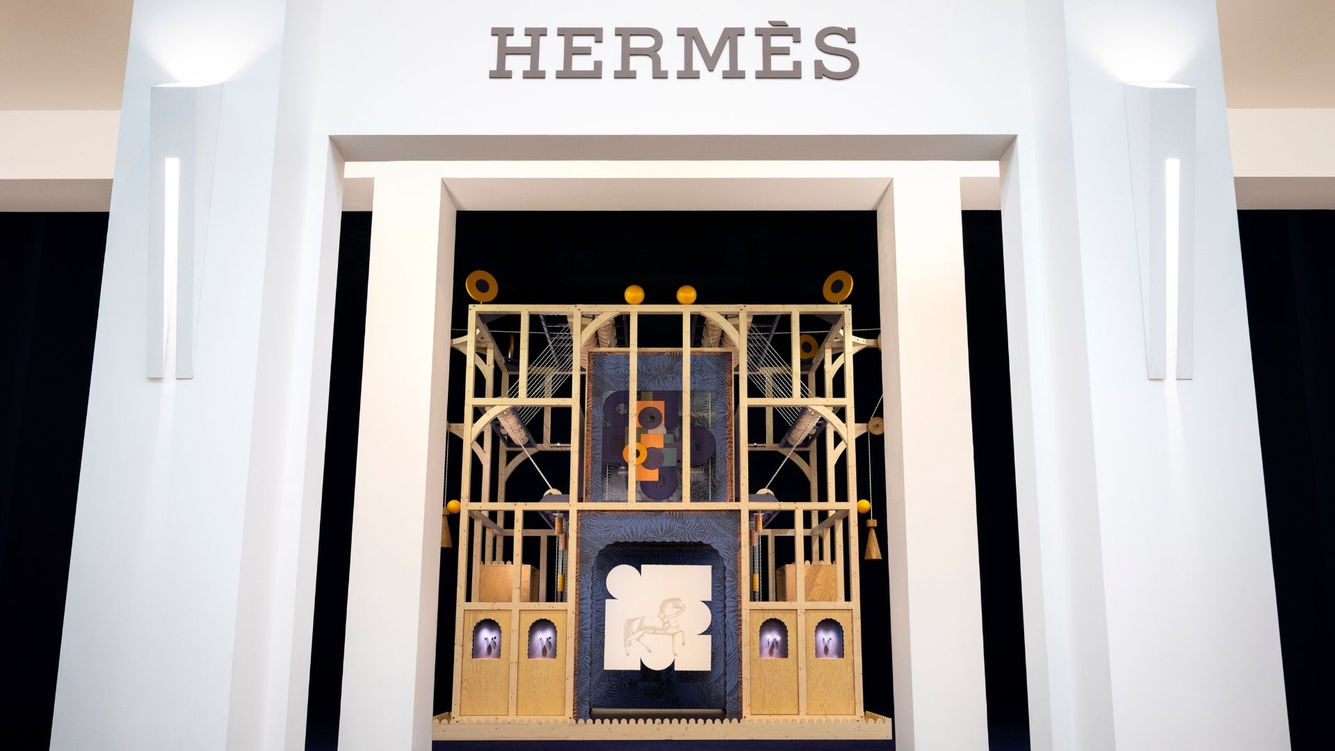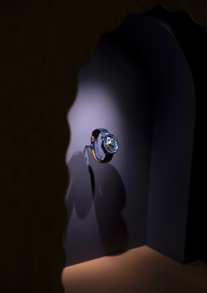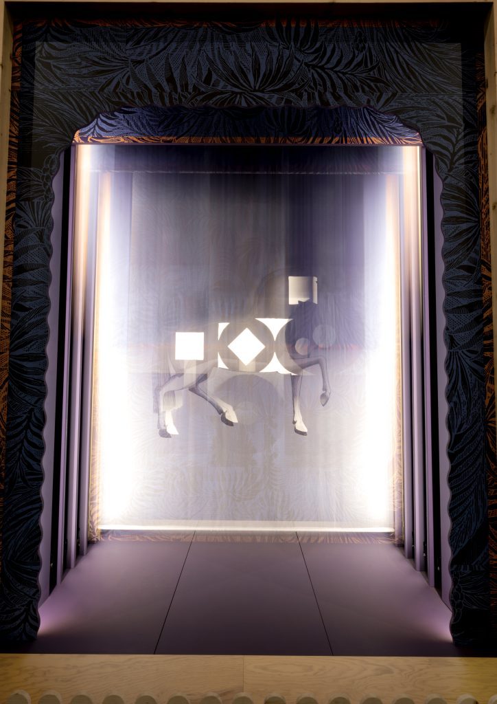 ในขณะเดียวกัน ภายในแกนกลางของโครงสร้างยังปรากฏ “เงาร่างม้า” ที่เคลื่อนไหวอย่างต่อเนื่อง สัญลักษณ์สำคัญของ Hermès ถูกถ่ายทอดผ่านรูปทรงเรขาคณิตที่สอดรับกับงานฉลุลายบนหน้าปัดนาฬิกา เสริมให้ภาพรวมของการจัดวางมีชีวิตและเรื่องราวยิ่งขึ้น ขณะที่ผนังไม้โดยรอบก็ขยับตอบสนองต่อการเคลื่อนไหวเหล่านั้น ราวกับเวทีที่กำลังดำเนินการแสดงแบบไม่มีจุดจบ