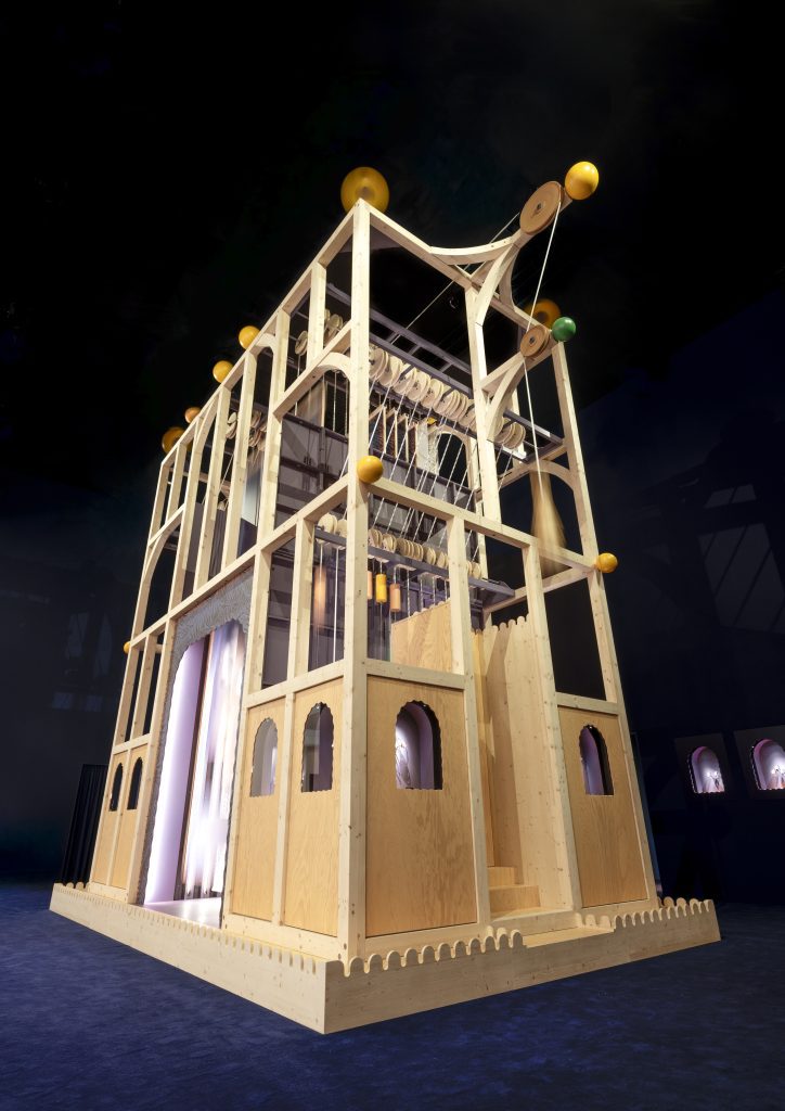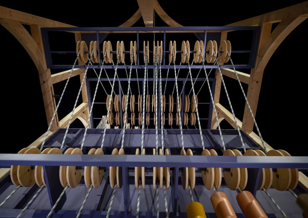 ผลงานครั้งนี้ออกแบบโดย Jean-Simon Roch ศิลปินที่สร้างสรรค์โครงสร้างจำลองคล้ายโรงงานไม้ขนาดย่อส่วน ตั้งตระหง่านด้วยแผ่นไม้สูง โปร่ง และเต็มไปด้วยช่องว่างให้มองทะลุเข้าไปยังกลไกภายใน โครงสร้างดังกล่าวถูกเชื่อมโยงด้วยระบบเชือก ลูกล้อ และรอกจำนวนมากที่เคลื่อนไหวตลอดเวลา เกิดเป็นจังหวะการทำงานที่ไม่เคยหยุดนิ่ง คล้ายกับกลไกของนาฬิกาที่เดินไปข้างหน้าอย่างไม่มีวันย้อนกลับ