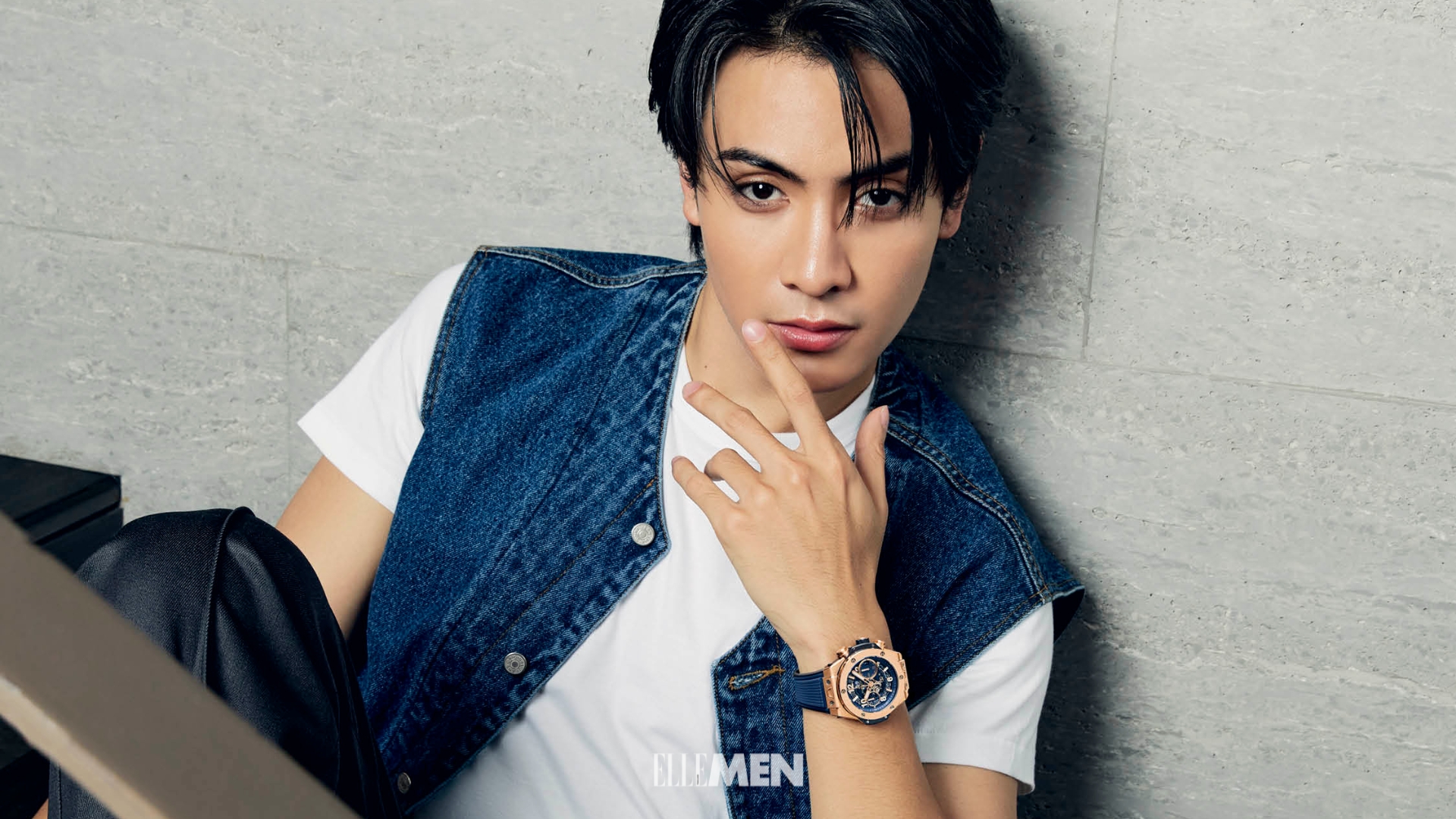 (รูปขวา) นาฬิกาข้อมือรุ่น Square Bang Unico Blue Ceramic 42 mm หน้าปัดไทเทเนียมเซรามิกสีน้ำเงิน จาก HUBLOT เสื้อเชิ้ตพร้อมเนกไท จาก FRI27NOV. แจ็กเก็ตหนัง จาก STYLIST’S OWN กางเกงพร้อมเข็มขัด จาก H&M x ROKH