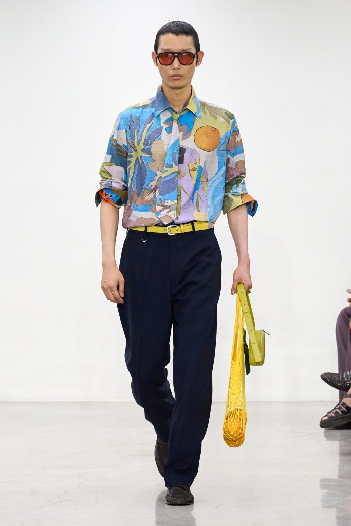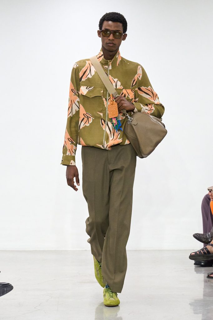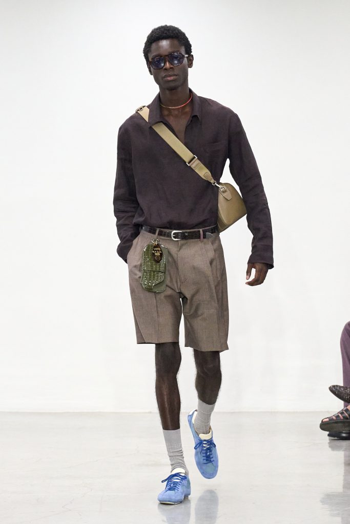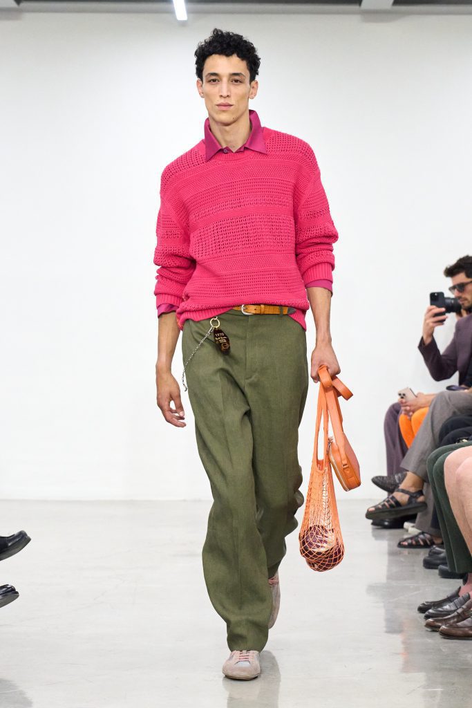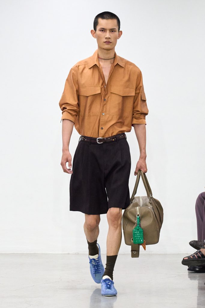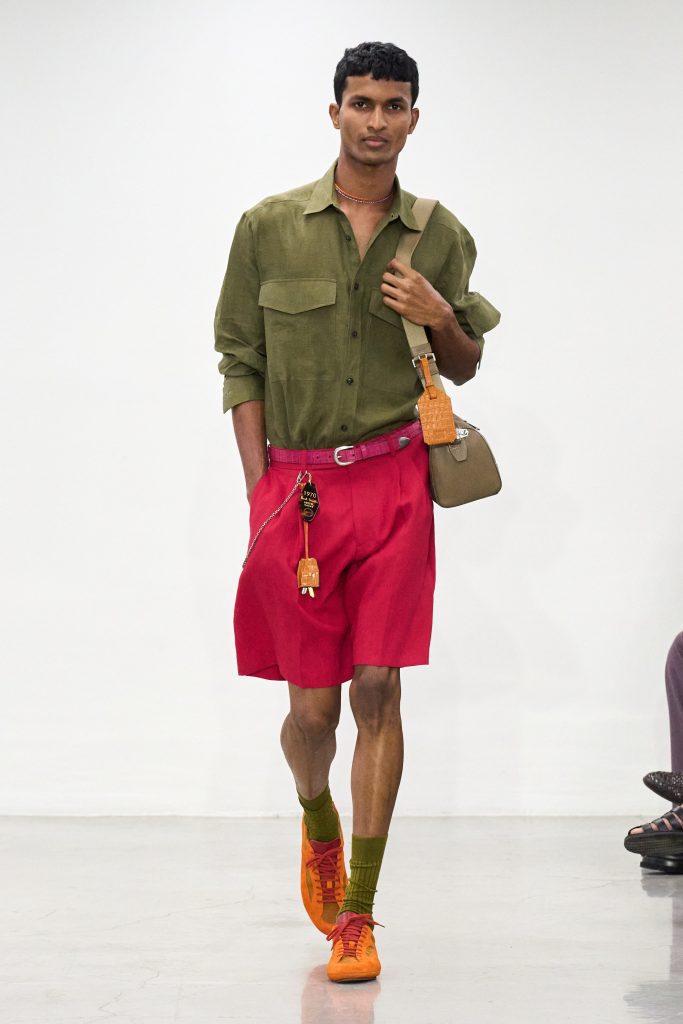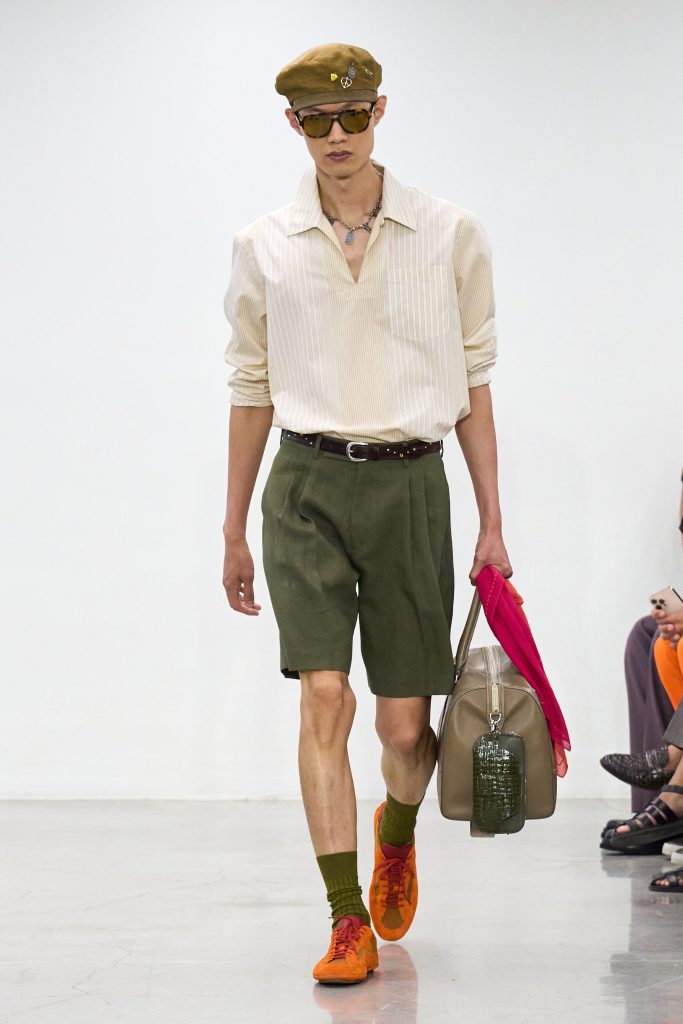 คอลเล็กชันนี้หยิบแรงบันดาลใจจากทริปแดนร้อนของเขาในช่วงหลายปีที่ผ่านมา ด้วยเฉดสีที่ดูเก่าจางเหมือนถูกแดดเลีย ค่อยๆ พาเรานึกถึงอียิปต์ โมร็อกโก และอินเดีย ผ้าที่ดูเหมือนผ่านการใช้งานเบาๆ เหมือนนักเดินทางที่ผ่านแผงเครื่องเทศมาแล้วนับไม่ถ้วน และเพราะมิลานกำลังเผชิญคลื่นความร้อน เสื้อเชิ้ตพิมพ์ลายเมืองร้อนที่ตัดเย็บด้วยผ้าบางเบา เสื้อกั๊กคอวีสีสันจัดจ้าน กางเกงเบอร์มิวดา และรองเท้าหนังพื้นแบนทรงสลิปเปอร์ รวมถึงสนีกเกอร์ทรงจักรยานน้ำหนักเบา จึงกลายเป็นไอเท็มที่ดู ‘ใช่’ อย่างยิ่งในช่วงซัมเมอร์