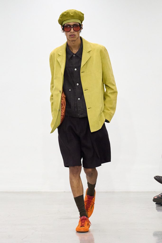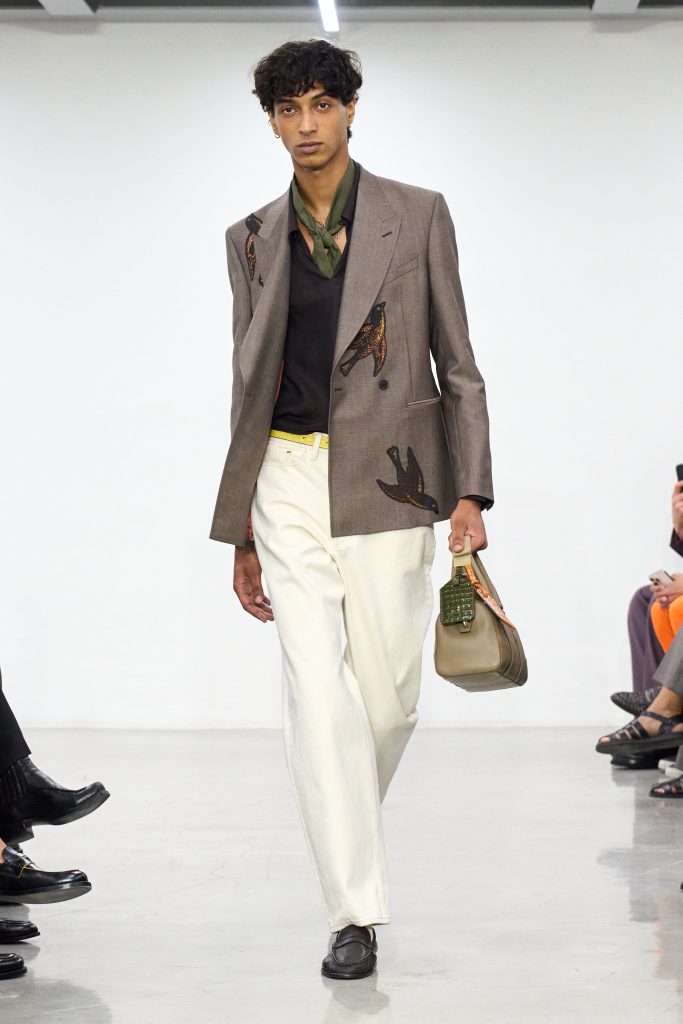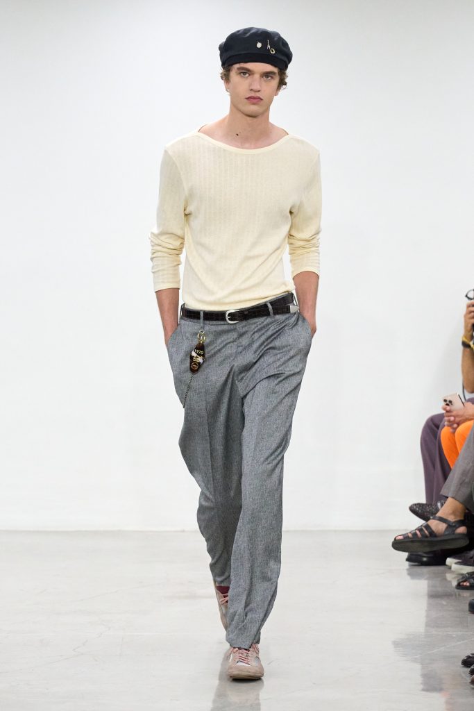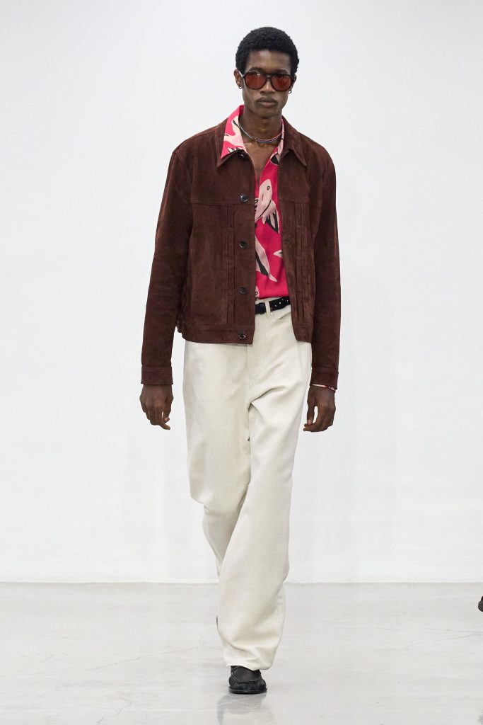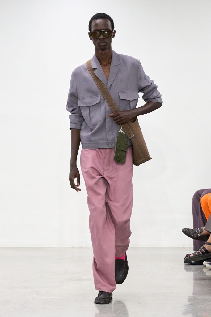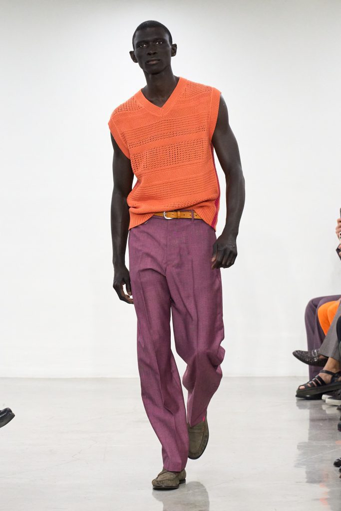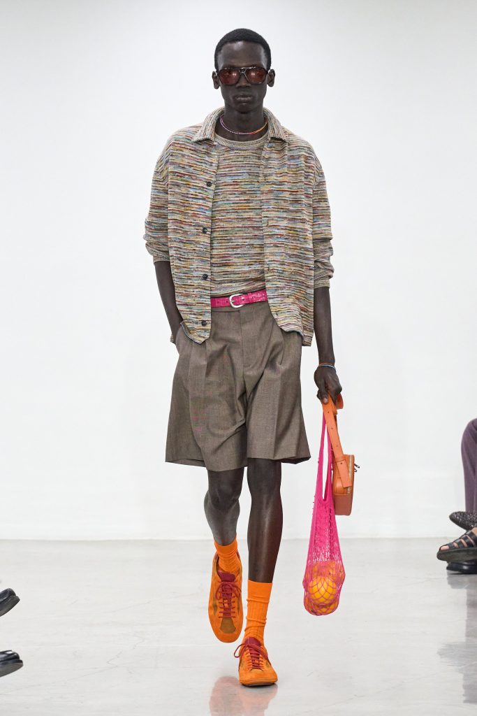 คอลเล็กชันนี้หยิบแรงบันดาลใจจากทริปแดนร้อนของเขาในช่วงหลายปีที่ผ่านมา ด้วยเฉดสีที่ดูเก่าจางเหมือนถูกแดดเลีย ค่อยๆ พาเรานึกถึงอียิปต์ โมร็อกโก และอินเดีย ผ้าที่ดูเหมือนผ่านการใช้งานเบาๆ เหมือนนักเดินทางที่ผ่านแผงเครื่องเทศมาแล้วนับไม่ถ้วน และเพราะมิลานกำลังเผชิญคลื่นความร้อน เสื้อเชิ้ตพิมพ์ลายเมืองร้อนที่ตัดเย็บด้วยผ้าบางเบา เสื้อกั๊กคอวีสีสันจัดจ้าน กางเกงเบอร์มิวดา และรองเท้าหนังพื้นแบนทรงสลิปเปอร์ รวมถึงสนีกเกอร์ทรงจักรยานน้ำหนักเบา จึงกลายเป็นไอเท็มที่ดู ‘ใช่’ อย่างยิ่งในช่วงซัมเมอร์