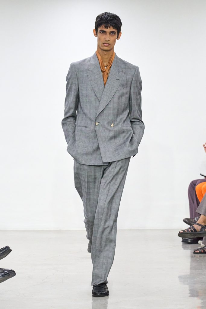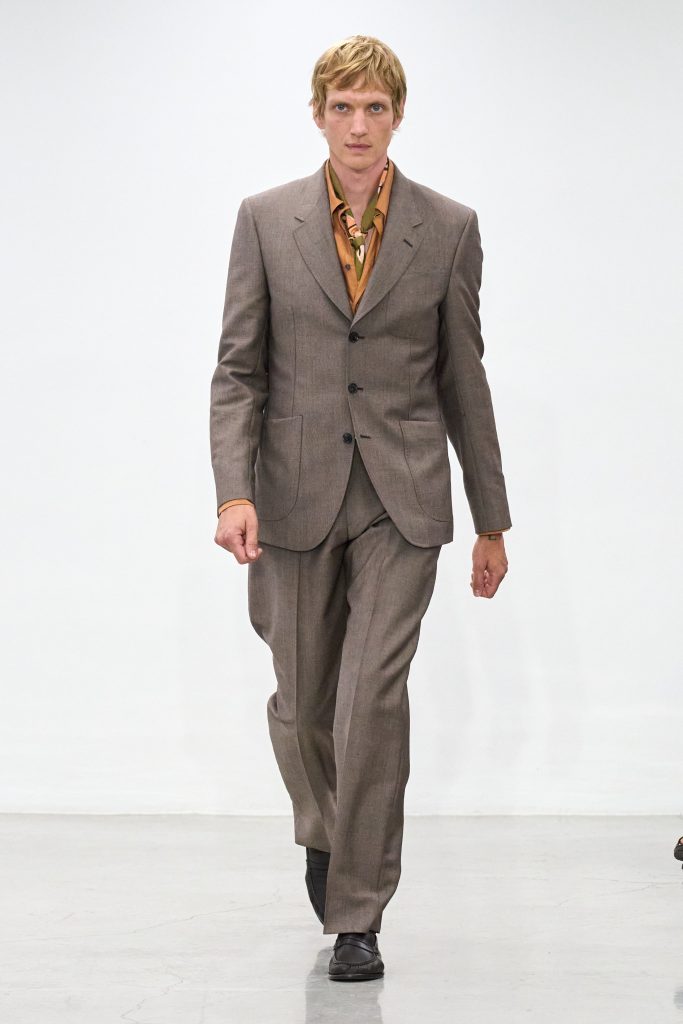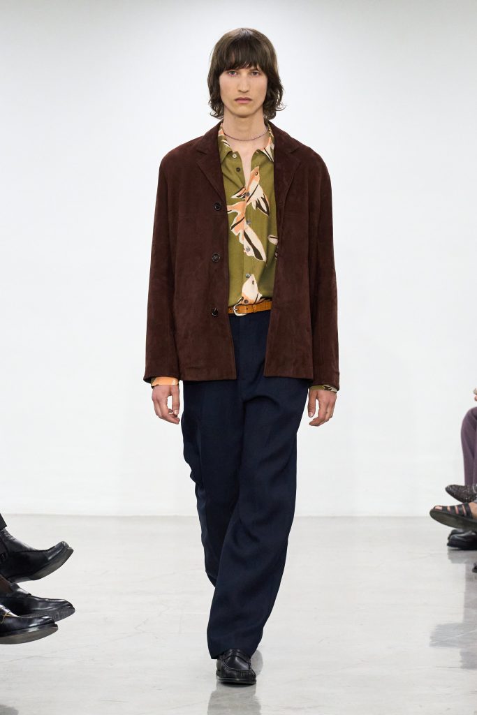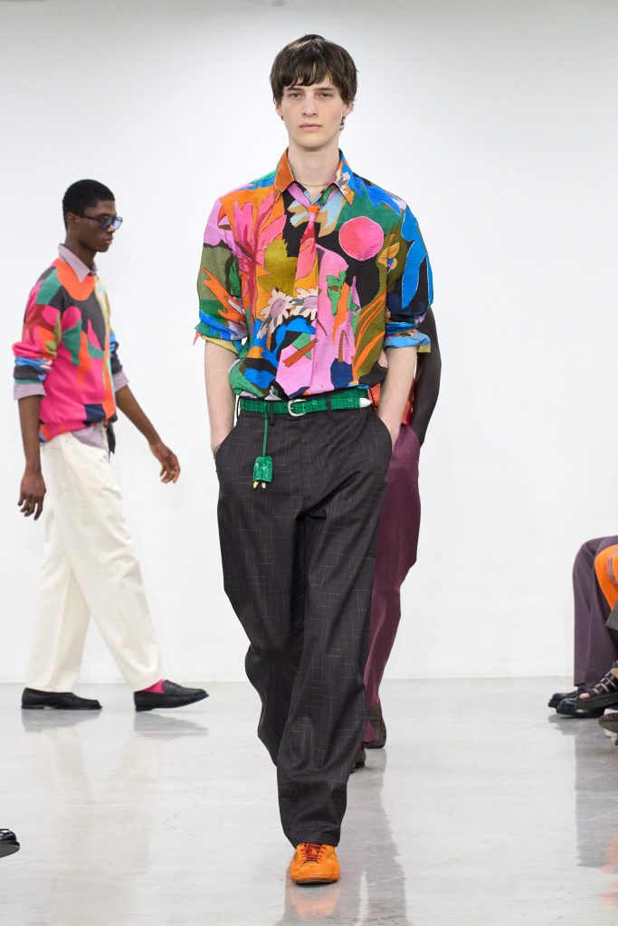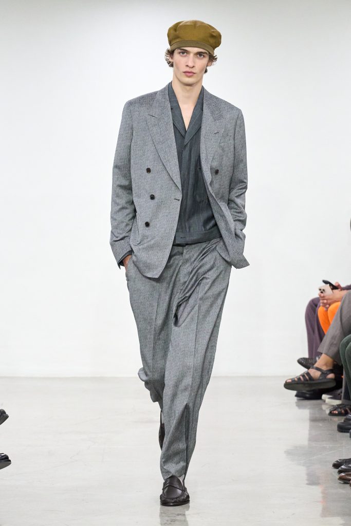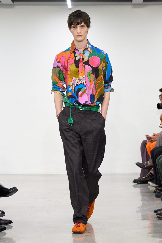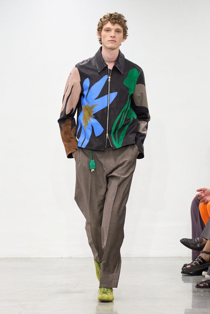 คอลเล็กชันนี้หยิบแรงบันดาลใจจากทริปแดนร้อนของเขาในช่วงหลายปีที่ผ่านมา ด้วยเฉดสีที่ดูเก่าจางเหมือนถูกแดดเลีย ค่อยๆ พาเรานึกถึงอียิปต์ โมร็อกโก และอินเดีย ผ้าที่ดูเหมือนผ่านการใช้งานเบาๆ เหมือนนักเดินทางที่ผ่านแผงเครื่องเทศมาแล้วนับไม่ถ้วน และเพราะมิลานกำลังเผชิญคลื่นความร้อน เสื้อเชิ้ตพิมพ์ลายเมืองร้อนที่ตัดเย็บด้วยผ้าบางเบา เสื้อกั๊กคอวีสีสันจัดจ้าน กางเกงเบอร์มิวดา และรองเท้าหนังพื้นแบนทรงสลิปเปอร์ รวมถึงสนีกเกอร์ทรงจักรยานน้ำหนักเบา จึงกลายเป็นไอเท็มที่ดู ‘ใช่’ อย่างยิ่งในช่วงซัมเมอร์
