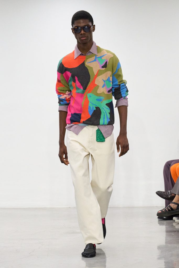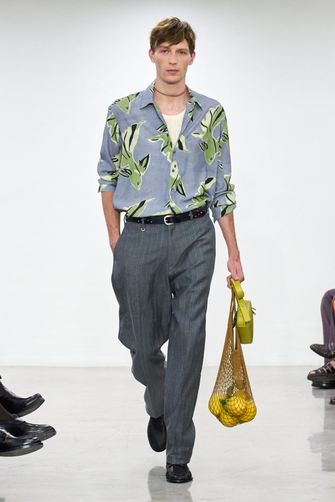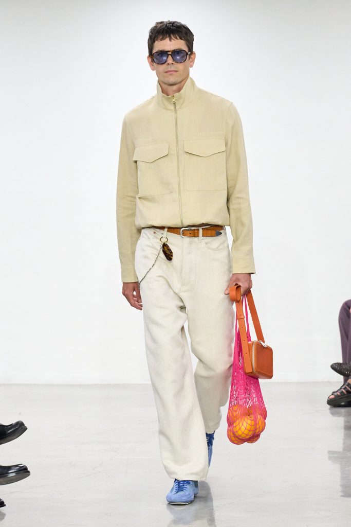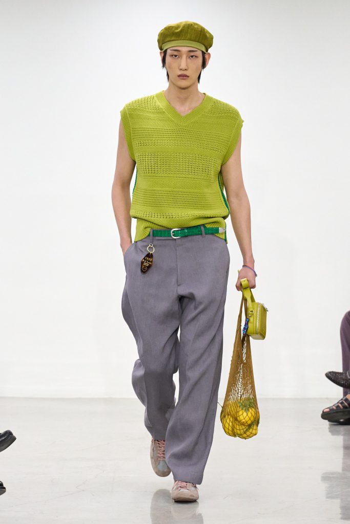 บรรยากาศเป็นกันเองเริ่มตั้งแต่ที่นั่ง ลังพลาสติกใส่อาหารหลากสีวางเรียงรายเป็นแถว ซึ่งเชื่อมโยงกับความหลงใหลใน ‘ตลาดสด’ ของสมิธ ที่เจ้าตัวมักถ่ายภาพแผงผลไม้สวยๆ ไว้เสมอ หนึ่งในโมเดลบนรันเวย์ถึงกับถือถุงตาข่ายใส่ส้มสดมาเดินตัดผ่าน ราวกับบอกเราว่า เสื้อผ้าชุดนี้ถูกออกแบบมาเพื่อ ‘ชีวิตจริง’ ไม่ใช่แค่รันเวย์