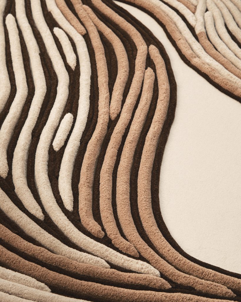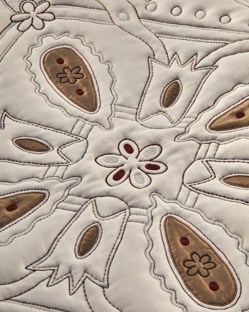 จากวัสดุธรรมชาติคุณภาพสูงที่ผ่านการคัดสรรอย่างเข้มงวด เส้นใยถูกนำมาแปรรูปผ่านเทคนิคที่หลากหลาย ไม่ว่าจะเป็นงานปักวัสดุ งานปักด้าย งานขัดเส้นใยก่อลวดลาย งานปักเข็มลายนูน งานเย็บปะ และการพิมพ์ลายลงบนผืนผ้า แต่ละเทคนิคต่างมีบทบาทในการกำหนดจังหวะของลวดลายและน้ำหนักของสิ่งทอ เพื่อให้สอดคล้องกับแนวคิดการออกแบบที่ต้องการถ่ายทอด